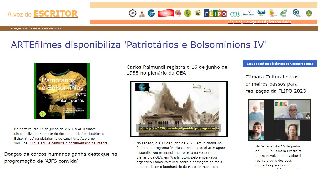 Neste domingo, dia 18 de junho de 2023, a Câmara Brasileira de Desenvolvimento Cultural disponibilizou em sua página na Internet a nova edição do semanário a Voz do Escritor, com notícias de interesse do mundo cultural. O endereço é www.camaracultural.com.br/voz20230618.htm
