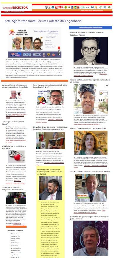 No domingo, dia 07 de dezembro de 2025, a Câmara Brasileira de Desenvolvimento Cultural disponibilizou em sua página na Internet a nova edição do semanário a Voz do Escritor, com notícias de interesse do mundo cultural, com destaque para anúncio de que o Canal Arte Agora vai transmitir Fórum Sudeste da Engenharia Nacional, a ação…