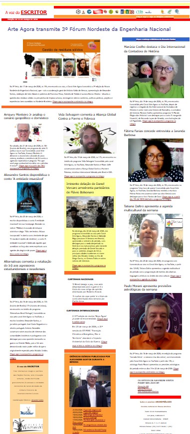 No domingo, dia 22 de março de 2026, a Câmara Brasileira de Desenvolvimento Cultural disponibilizou em sua página na Internet a nova edição do semanário A Voz do Escritor, com notícias de interesse do mundo cultural, com destaque para a transmissão do III Fórum Nordeste da Engenharia Nacional pelo Canal Arte Agora, comentários sobre a…